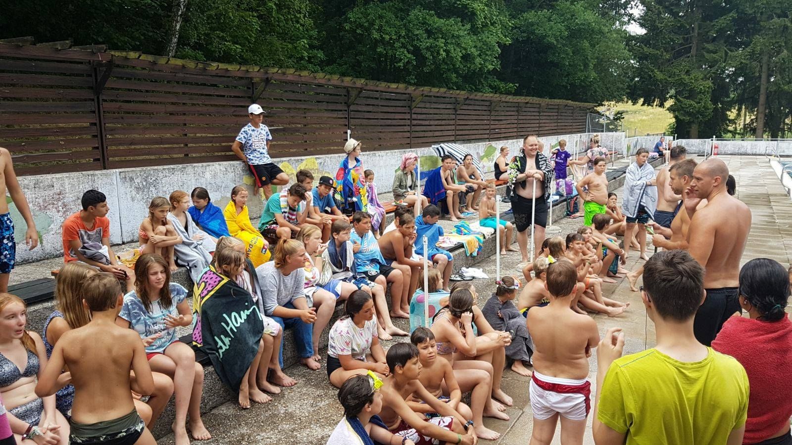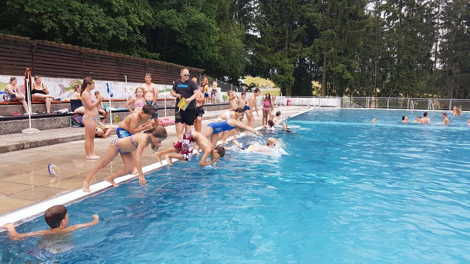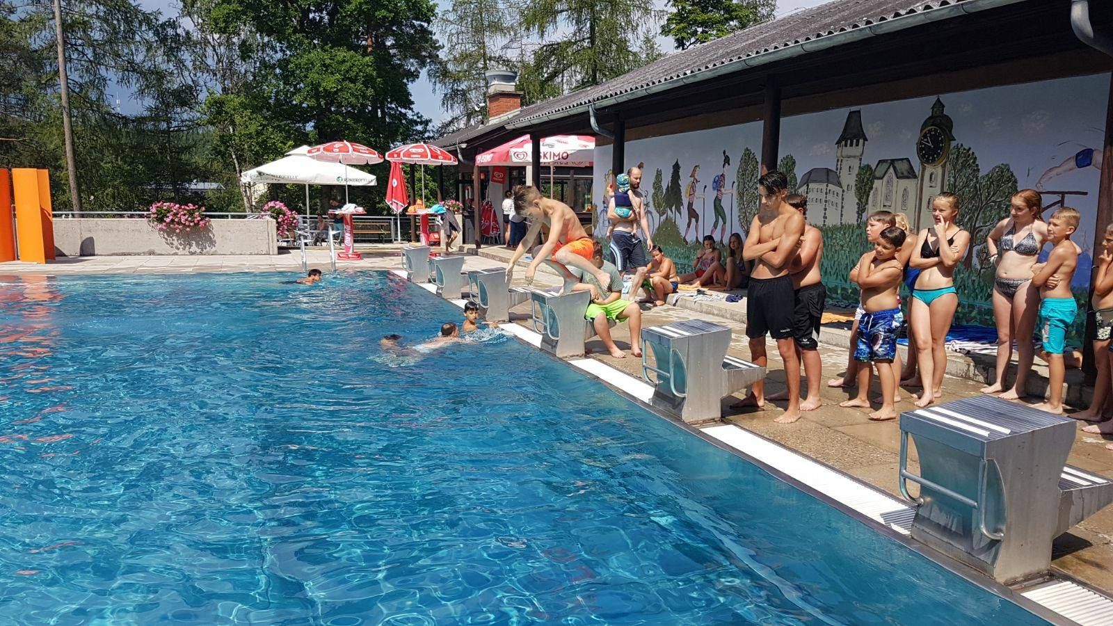 Vyhřívaný sportovní bazén, dětský bazén, velká plocha na opalování, bufet, dětské hřiště, šatny, WC, tobogán, vodní hřiště.