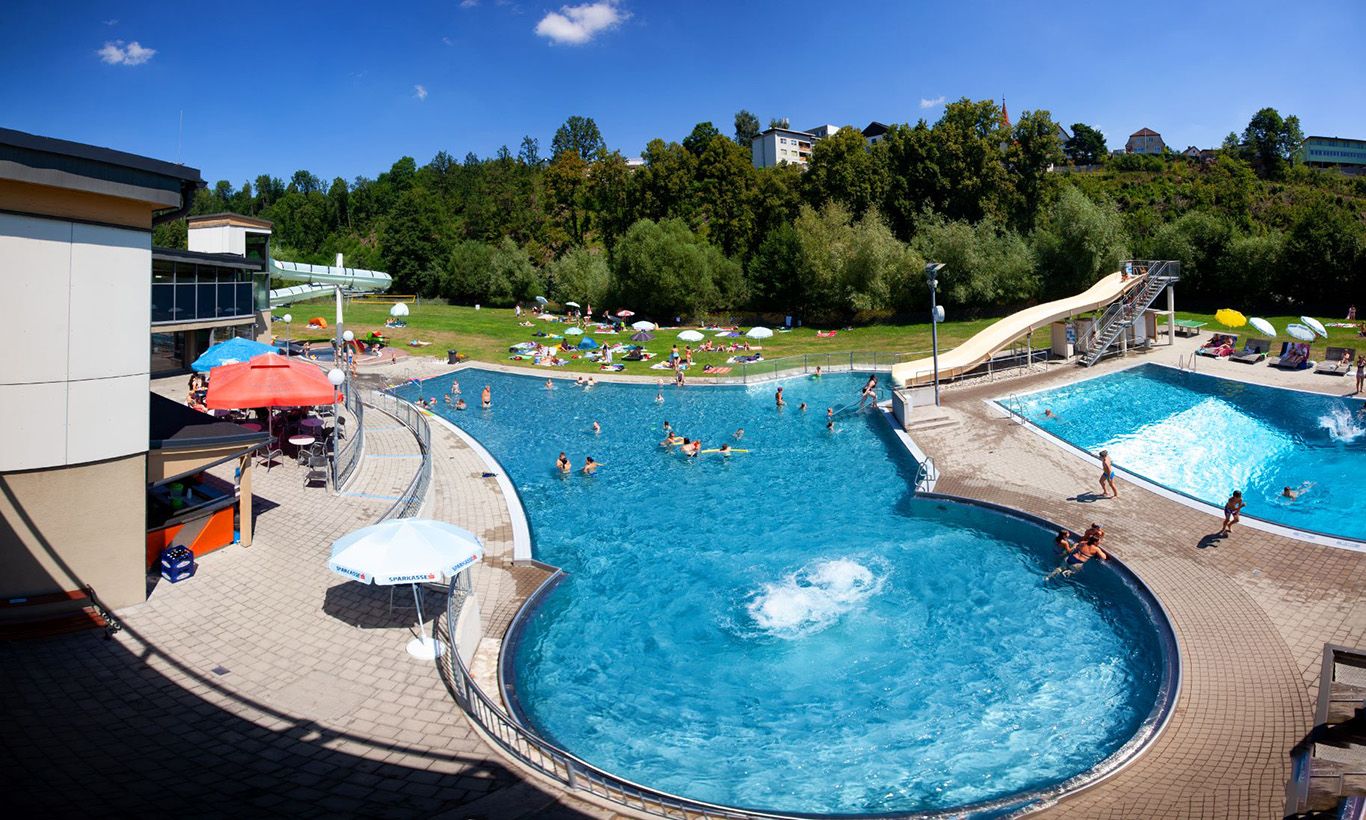 Venkovní bazén je vybaven skokanským bazénem s jedno- a třímetrovým prknem, dětským bazénem, zážitkovým bazénem s proudovým kanálem a podlahovými tryskami. Highlight: 16 metrů dlouhý široký tobogán!